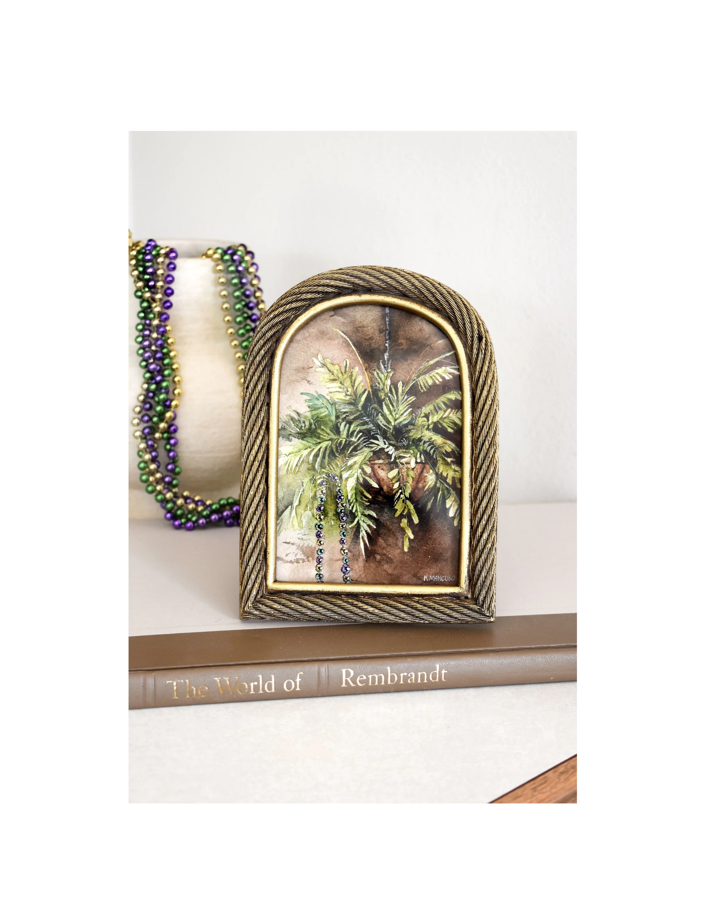 This is an original painting that comes in its own gold, arched frame. Comes framed with glass and has a small hook for hanging, but can also stand on its own.